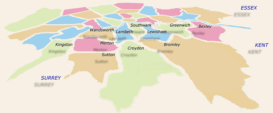 London Boroughs: Bexley, Bromley, Croydon, Greenwich, Kingston, Lambeth, Lewisham, Southwark, Wandsworth